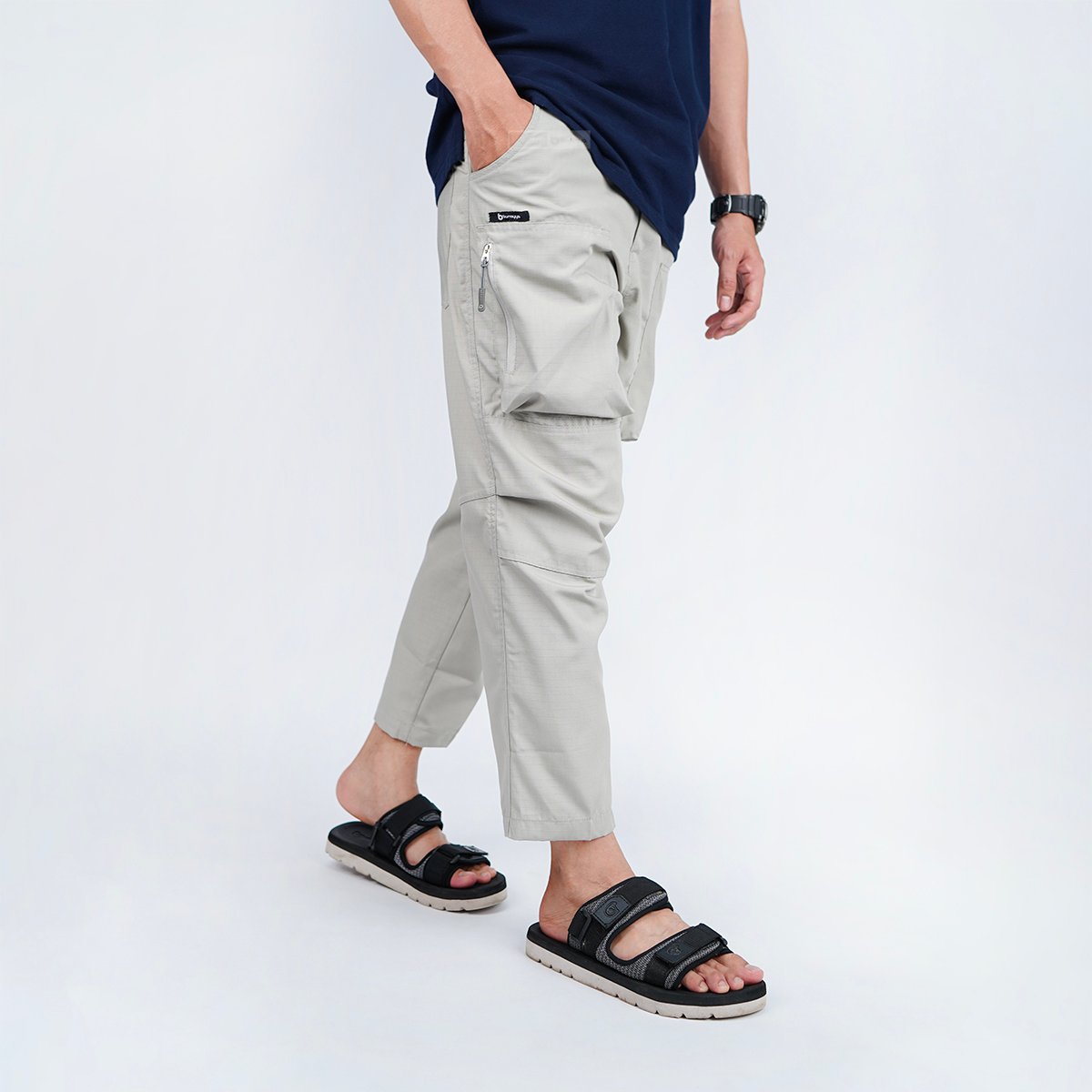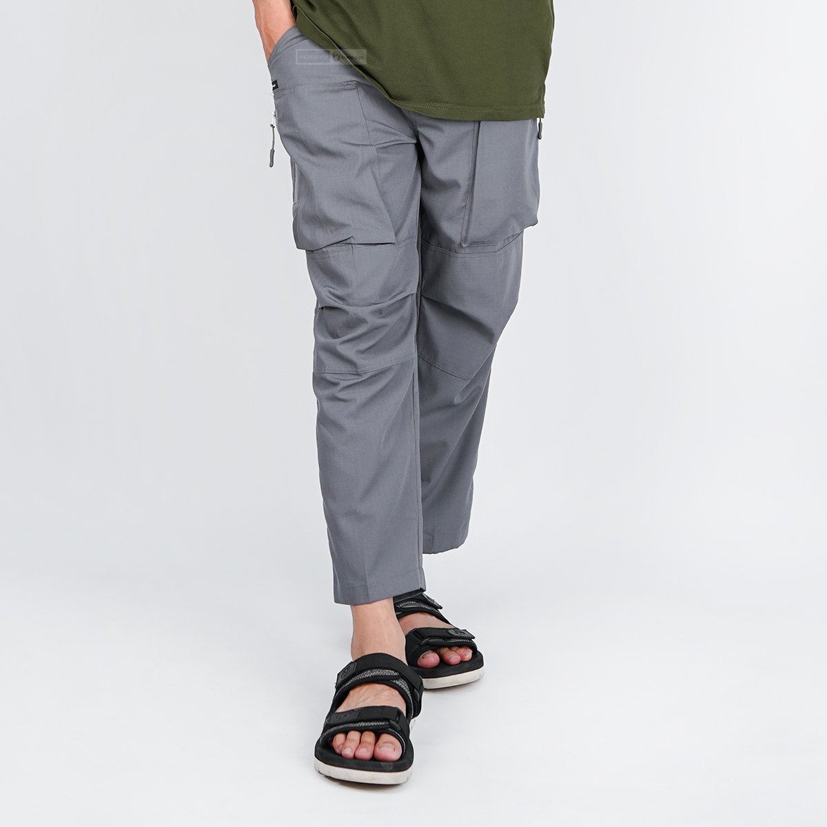 Pinggangnya menggunakan karet sebagian dan kantong dilengkapi dengan resleting